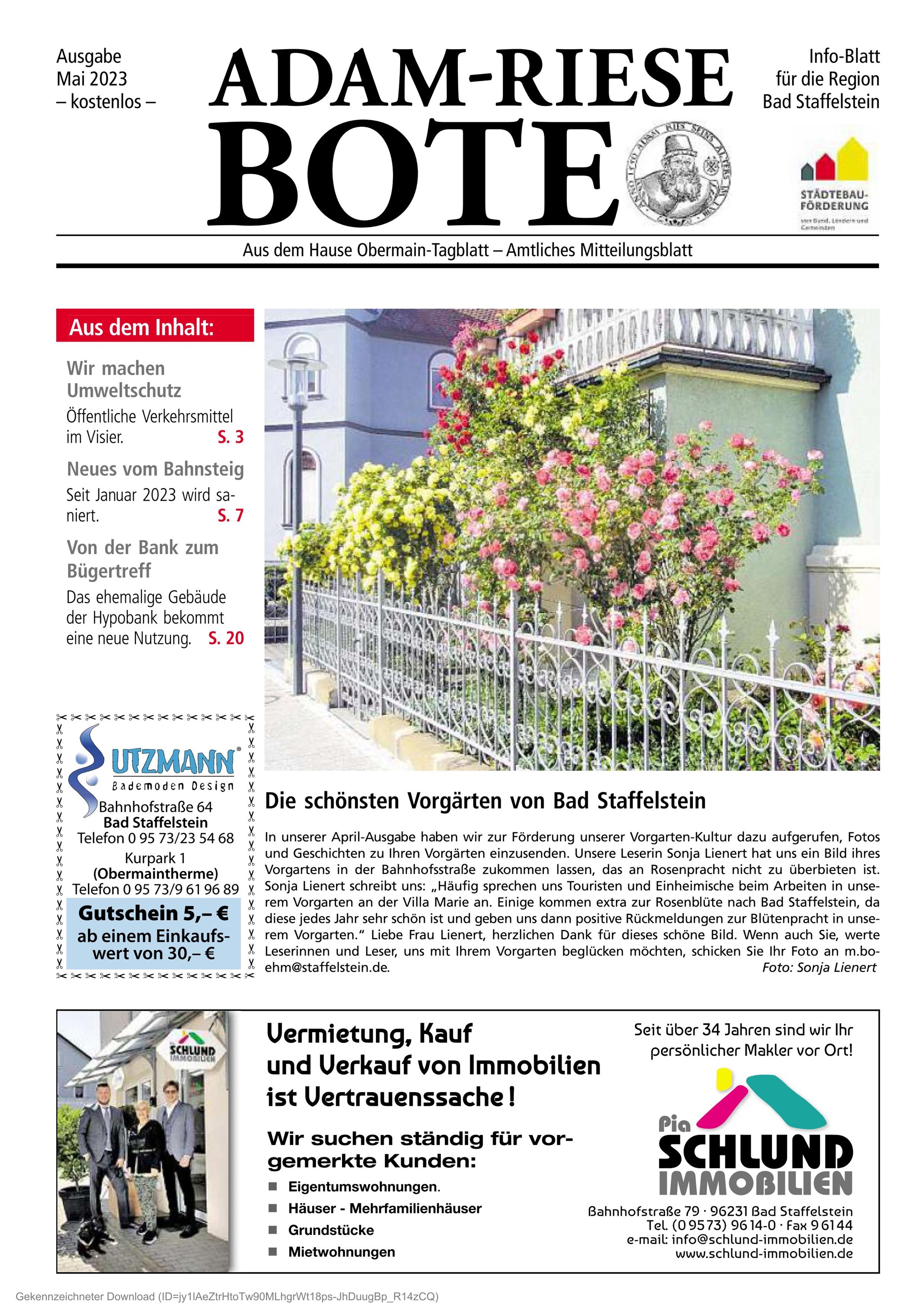 Stadt Bad Staffelstein mit dem Obermain-Tagblatt durch das Quartiersmanagement produziert, gedruckt und monatlich an alle Haushalte in Bad Staffelstein verteilt. Der redaktionelle Anteil, welcher durch den Quartiersmanager Michael Böhm thematisiert und geschrieben wurde, beschäftigte sich zu großen Teilen mit städtebaulichen Themen der Stadt Bad Staffelstein und konnte somit auch zur Investoren-Akquise genutzt werden.