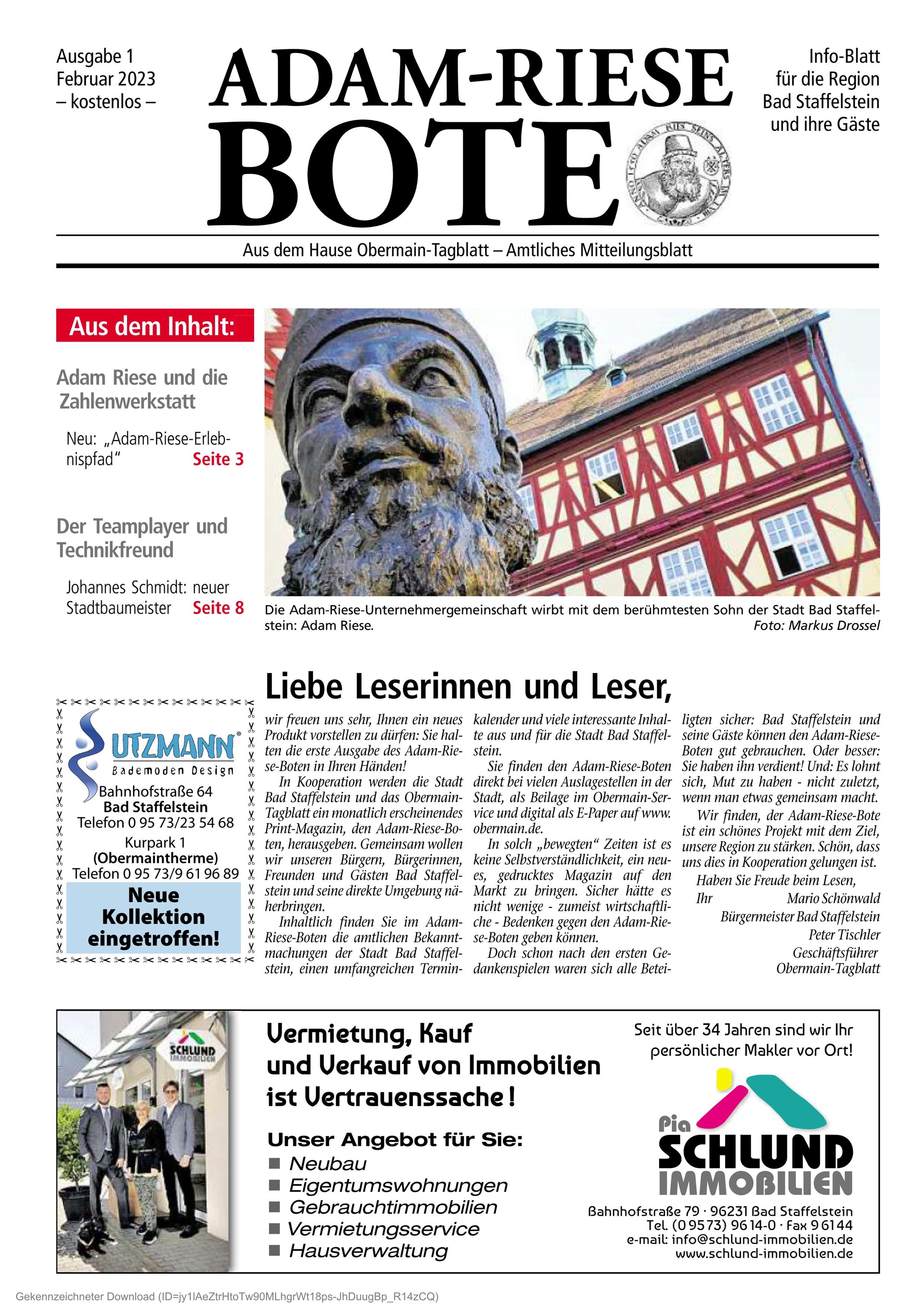 Nach zwei Jahren vorbereitender Gespräche beginnen die Verhandlungen für die Print-Ausgabe des neuen Adam-Riese-Boten für Bad Staffelstein. Redaktionell werden in den monatlich erscheinenden Print-Ausgaben für alle Haushalte in Bad Staffelstein die Schwerpunkte auf die städtebaulichen Aktivitäten in der Stadt gesetzt.